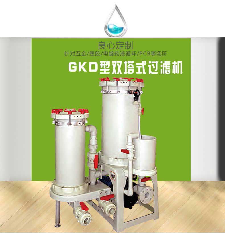 双塔式电镀过滤机原理: 过滤机工作原理:过滤药液在强大的压力下被送入滤室,进入滤室的过滤药液其固体部分被过滤棉芯(滤布)截留在滤芯上,液体部分透过过滤棉芯而排出滤室,从而达到固液分离的目的,随着压力的增加,固液分离则更明显,但从能源和成本方面考虑,过高的加压不划算。 东莞市塑宝泵业有限公司研发的这款电镀药液过滤机广泛应用:五金、塑胶、电镀药液循环过滤制程、PCB、电镀液等工艺。
